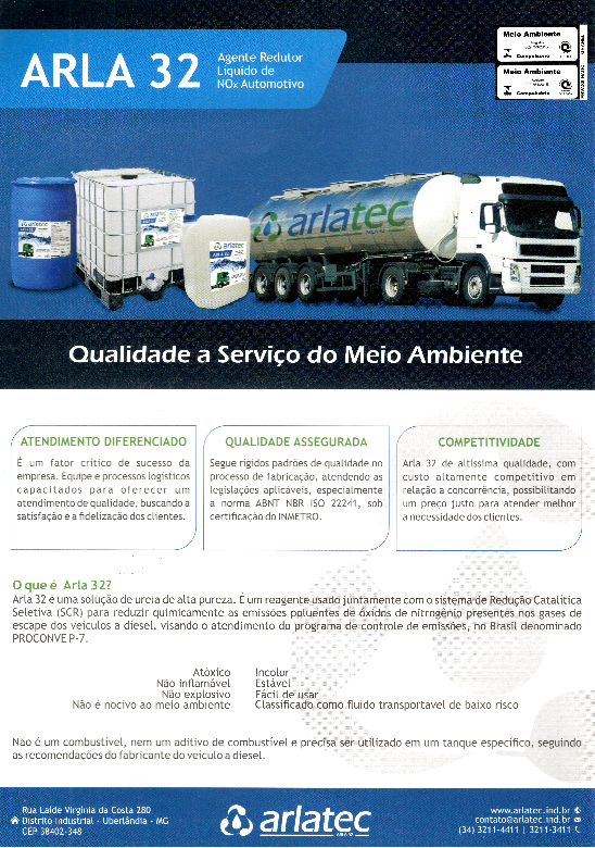 A ARLATEC fornece o Arla 32 para frotas de caminhões e ônibus de todas dimensões e potências atendendo o PROCONVE -Programa de Controle de Emissões Veiculares estabelecido pelo CONAMA - Conselho Nacional do Meio Ambiente. Quer você use pequenas ou grandes quantidades, podemos fornecer Arla 32 para atender as suas necessidades.